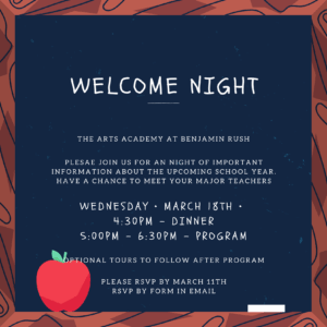 WELCOME NIGHT INVITES HAVE BEEN SENT OUT. IF YOU HAVE NOT RECEIVED AN EMAIL PLEASE REACH OUT TO MRS. HENSHAW saberent@philasd.org.